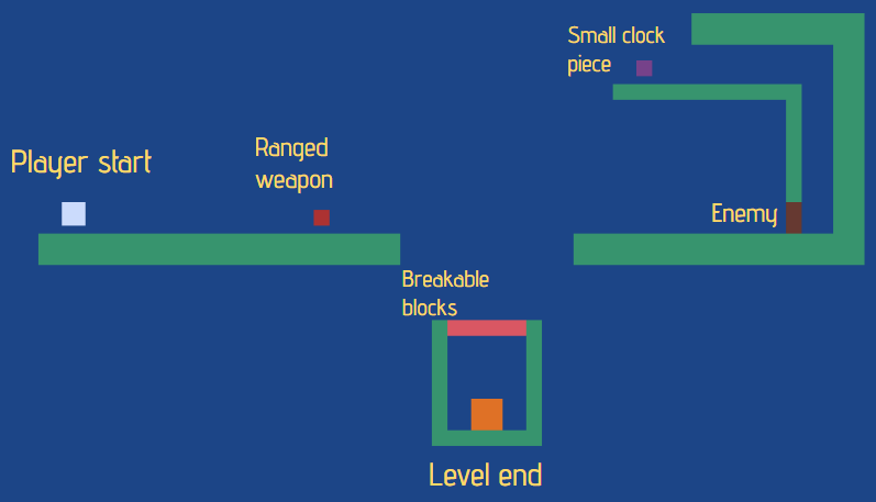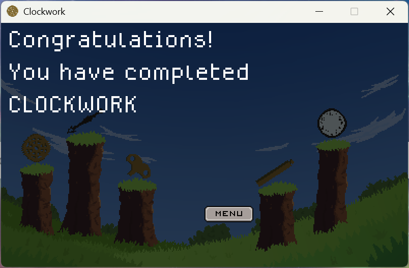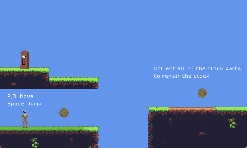 Clockwork is a 2D platformer game where the player collects pieces of a clock to complete each level. Different clock pieces give the player new abilities which are used to beat the level. The player only has access to the most recently picked up item’s ability.