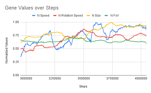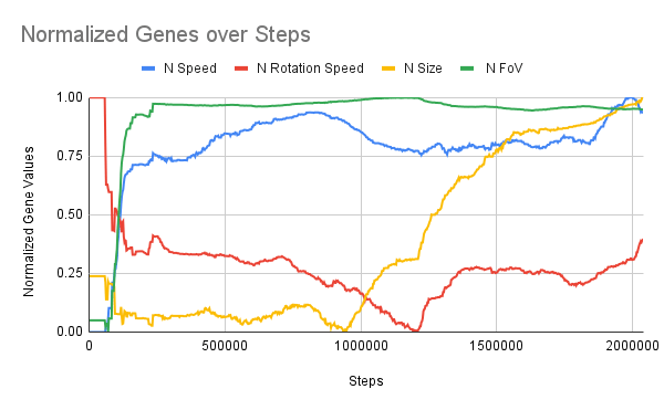 Different statistics of the simulation are recorded in a CSV file every x steps (usually 1000). These values can be imported into spreadsheets (I use google sheets) to graph the change in gene values over time. The gene values are more coherent when normalized.