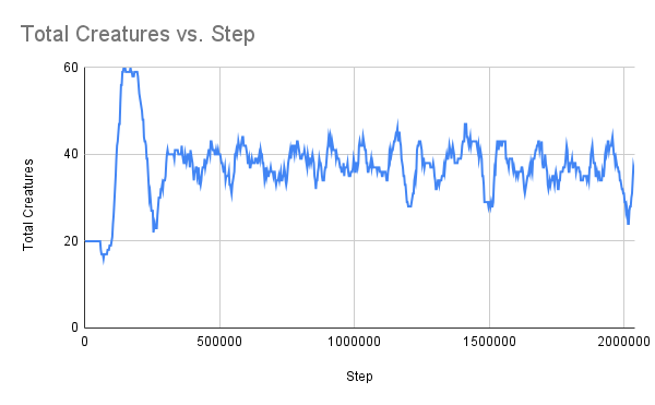 This graph was from a simulation on a map approx. 25x bigger than what I usually use. When the population becomes stable the graph shows a sine like cycle of highs and lows because when there are more creatures there is less energy per creature, so many die, and when there are few creatures they each gain more energy and reproduce.